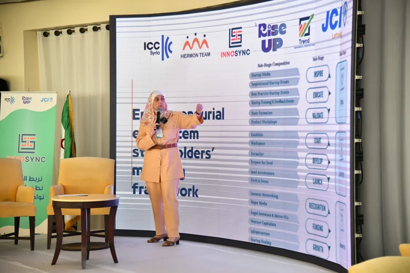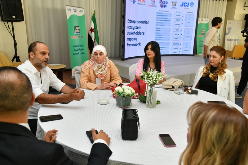 Among the featured speakers was Ms. Sahar Issa, Regional Director of the UNDP Program in the Syrian Coast, who addressed the role of international organizations in supporting entrepreneurs and outlined available funding opportunities. Mr. Akram Zeidan, Business Development and Project Management Expert at Hermon Team, presented the company’s vision for entrepreneurial innovation and the development of sustainable business ecosystems. The discussion also featured Ms. Dina Shouman, entrepreneur and founder of the “Silah” employment platform, who shared practical insights from her experience in launching a startup that supports the labor market.